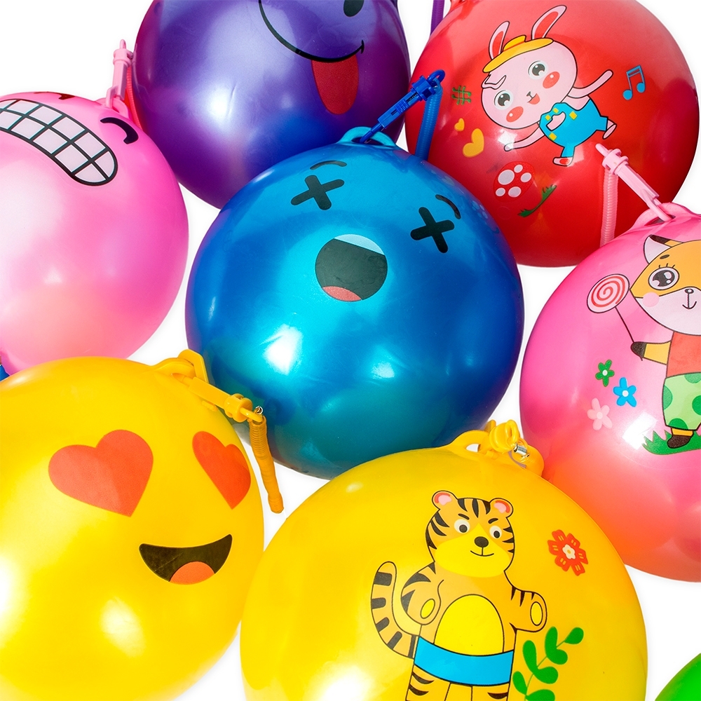 Bola inflável em vinil acompanhada de cordão em mola plástica flexível com mosquetão em uma extremidade e argola metálica na outra.