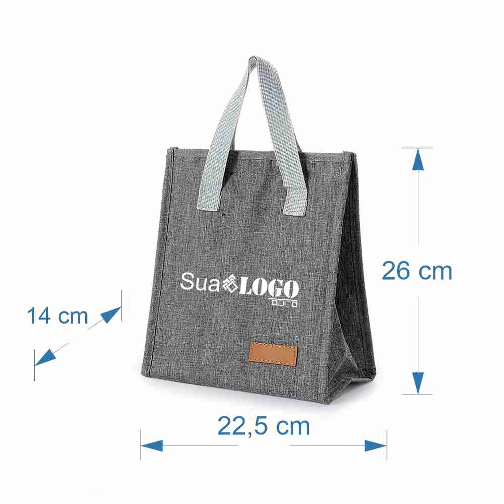 Bolsa térmica oxford com capacidade de 8 litros com fechamento em velcro. Contém alças de mãos e plaquinha personalizável fixa.