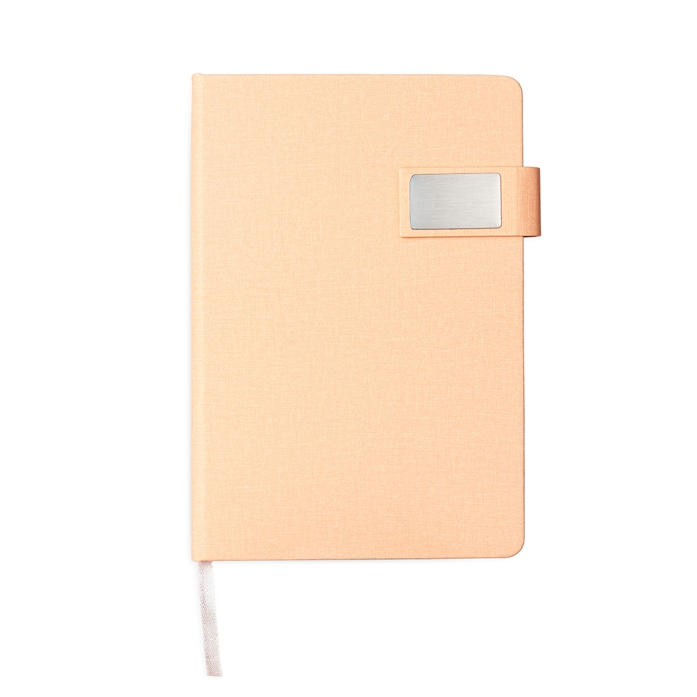 Caderneta capa dura em couro sintético com fecho magnético, placa metálica personalizável, além de marca-página em fita de cetim e aproximadamente 96 folhas brancas pautadas.
