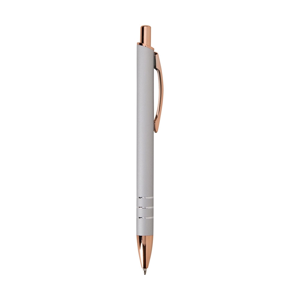 Caneta metálica com acionamento por clique e carga esferográfica azul de 1.0mm, uma combinação que oferece pegada leve para uma escrita mais precisa.