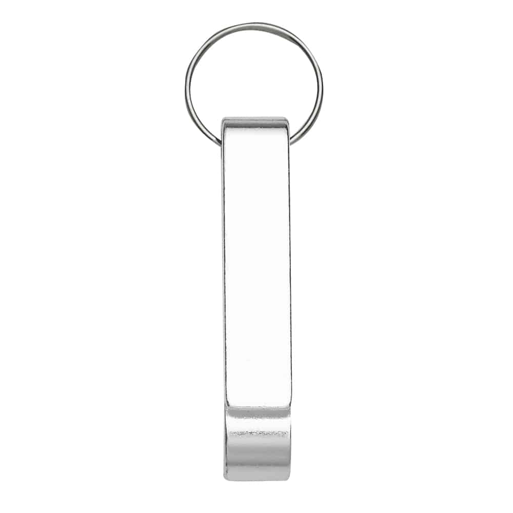 Chaveiro metálico com abridor de garrafas e argola de ferro niquelado.
