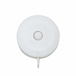Fita métrica de formato circular em plástico com fita flexível em PVC e fibra de vidro com marcação em dupla face, puxador de plástico na ponta externa, botão de trava/destrava e alcance máximo de 1,5 metro.