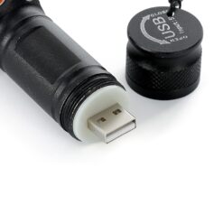 Lanterna led recarregável com zoom de regulagem e três estágios de iluminação, material metálico com USB acoplado para carregamento. Acompanha cordão de nylon.
